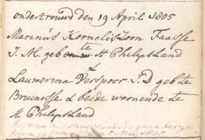 1MarinusKornelisz.Faasseisgeborenop14januari1778inSt.Philipsland,zoonvanCornelisFaasseenJannaMoerland.Marinusisoverledenop 13mei1849inSt.Philipsland,71jaaroud.Marinustrouwde,27jaaroud,op5mei1805inSt.PhilipslandmetLauwerinaVerspoor,24jaaroud, nadatzijop19april1805inSt.Philipslandinondertrouwzijngegaan.Lauwerina(Lourina/Laurintje)isgeborenop21maart1781inBruinisse, dochter van Leendert Joosse Verspoor en Lena Adriaanse Ellewit. Lauwerina is overleden op 9 juni 1828 in St. Philipsland, 47 jaar oud. Kinderen van Marinus en Lauwerina:1.1.CornelisFaasseisgeborenop16januari1810inSt.Philipsland,zoonvanMarinusFaasse(1)enLauwerinaVerspoor.Hijisgedooptop21 januari1810inSt.Philipsland.Cornelisisoverledenop2augustus1891inSt.Philipsland,81jaaroud.Cornelistrouwde,28jaaroud,op19 mei1838inSt.PhilipslandmetAdriaantjevanOeveren,22jaaroud.Adriaantjeisgeborenop6juli1815inSt.Philipsland,dochtervan Cornelia van Oeveren. Adriaantje is overleden op 10 februari 1903 in St. Philipsland, 87 jaar oud. Kinderen van Cornelis en Adriaantje: 1.2. N.N. Faasse, levenloos geboren kind, geboren op 14 september 1811 in St. Philipsland.1.3.LenaFaasseisgeborenop29september1812inSt.Philipsland,dochtervanMarinusFaasse(1)enLauwerinaVerspoor.Lenaisoverledenop19augustus1896inBruinisse,83jaaroud. Lenatrouwde,22jaaroud,op12oktober1834inBruinissemetJacobKerpestein,23jaaroud.Jacobisgeborenop27februari1811inBruinisse,zoonvanWillemKerpesteinenAdriana Jacobusse van Oeveren. Jacob is overleden op 15 juni 1899 in Bruinisse, 88 jaar oud. Kinderen van Lena en Jacob: 1.4.JannaFaasseisgeborenop18september1815inSt.Philipsland,dochtervanMarinusFaasse(1)enLauwerinaVerspoor.Jannaisoverledenop28april1901inSt.Philipsland,85jaar oud.Jannatrouwde,21jaaroud,op5augustus1837inSt.PhilipslandmetJandeGraaf,28jaaroud.Janisgeborenop24maart1809inSt.Philipsland,zoonvanJannesdeGraafen JannetjevanderVliet.Hijisgedooptop26maart1809inSt.Philipsland.Janisoverledenop21januari1879inSt.Philipsland,69jaaroud.JanisweduwnaarvanTannetjeNelisse(1805-1835), met wie hij trouwde op 22 juni 1833 in St. Philipsland. Kinderen van Janna en Jan: 1.5. Leendert Faasse, geboren op 28 december 1818 in St. Philipsland. Leendert is overleden in december 1818 in St. Philipsland, ten hoogste 3 dagen oud.1.6.ThonaFaasseisgeborenop26mei1820inSt.Philipsland,dochtervanMarinusFaasse(1)enLauwerinaVerspoor.Thonaisoverledenop19februari1897inSt.Philipsland,76jaaroud. Thonatrouwde,28jaaroud,op29september1848inSt.PhilipslandmetJohannisManneke,25jaaroud.Johannisisgeborenop6februari1823inSt.Maartensdijk,zoonvanLeendert Manneke en Elisabeth Polderman. Johannis is overleden op 17 juli 1907 in St. Philipsland, 84 jaar oud. Het huwelijk van Thona en Johannis bleef kinderloos.1.7. Teuntje Faasse, geboren op 20 augustus 1823 in St. Philipsland. Teuntje is overleden op 20 augustus 1823 in St. Philipsland, geen dag oud.