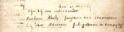 Gezinskaart: Anthoni Abels, * 1615 in Stavenisse, † 1662 zv. Abel Abelsz van Caashoeck en Geertruyt Jans.tr. 1640: Elizabeth Adriaens, * 1619, † 1667, dv. Adriaen Soutendam & Adriaentje Joos. Elizabeth hertrouwde op 17 januari 1663 in Stavenisse met Jacob Michielsen (* 1635 - † 1680). Kinderen:1. Abel Abels, * 1640, † 1649.2. Adriaen Abels, * 1641, † 1698. 3. Geertruid Abels, * 1643, † 1667.4. Maria Abels, * 1646, † 1671.5. Elisabeth Abels, * 1648, † 1651.6. Abigail Abels, * 1648, † 1651.7. Abel Abels, * 1649, † 1654.8. Abigail Abels, * 1651, † 1710. 9. Abel Abels, * 1654, † 1724. 10. Johannis (Anthonissen) Kaashoek, * 1656, † 1739. 11. Adriaentje Abels, * 1659.12. Abraham Abels, * 1661.