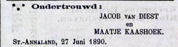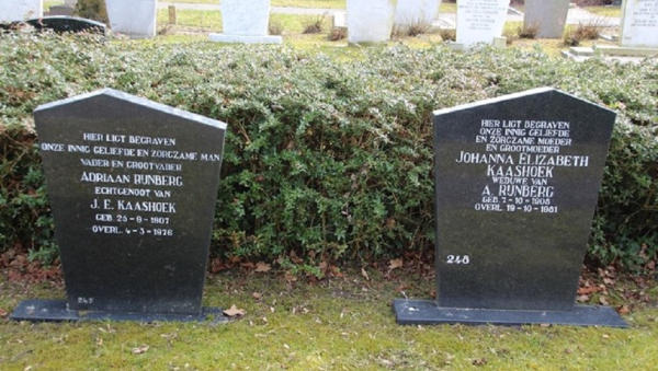 1JacobKaashoekisgeborenop30oktober1791inSt.Maartensdijk,zoonvanAnthonyKaashoekenGeertruijBoer.Jacobisoverledenop31juli1848inPoortvliet,56jaaroud.Jacobtrouwde, 28jaaroud,op4mei1820inSt.AnnalandmetMaatjeTichelaar,17jaaroud.Maatjeisgeborenop9januari1803inDinteloord,dochtervanJohannisTichelaarenJohannavanNieuwenhuizen. Maatje is overleden op 5 april 1839 in Stavenisse, 36 jaar oud. Kinderen van Jacob en Maatje:1.1. Johanna Kaashoek, geboren op 22 juli 1820 in St. Annaland. Johanna is overleden op 26 september 1820 in St. Annaland, 2 maanden oud. 1.2.GeertruiKaashoekisgeborenop22september1822inSt.Annaland,dochtervanJacobKaashoek(1)enMaatjeTichelaar.Geertruiisoverledenop22maart1881in’s-Heer Arendskerke,58jaaroud.Geertruitrouwde,21jaaroud,op29september1843inStavenissemetAdriaanHoek,27jaaroud.Adriaanisgeborenop30augustus1816inStavenisse,zoon van Izak Abrahamse Hoek en Neeltje Adriaanse Dorst. Adriaan is overleden op 5 februari 1890 in ’s-Heer Arendskerke, 73 jaar oud. Kinderen van Geertrui en Adriaan:1.2.1.IzaakHoekisgeborenop24april1844inStavenisse,zoonvanAdriaanHoekenGeertruiKaashoek(1.2).Izaakisoverledenop21januari1907inBorssele,62jaaroud.Izaak trouwde,41jaaroud,op14augustus1885in’s-HeerArendskerkemetCatharinaMurre,27jaaroud.Catharinaisgeborenop12oktober1857in’s-HeerArendskerke,dochtervan Geerard Murre en Thona Remijn. Catharina is overleden op 21 april 1933 in Borssele, 75 jaar oud. Kinderen van Izaak en Catharina:1.2.1.1.GeertruiHoekisgeborenop16mei1886in’s-HeerArendskerke,dochtervanIzaakHoek(1.2.1)enCatharinaMurre.Geertruiis overledenop19oktober1951inBorssele,65jaaroud.Geertruitrouwde,18jaaroud,op4mei1905inBorsselemetCornelisLeijs,23jaaroud. Cornelisisgeborenop17januari1882inBorssele,zoonvanPieterLeijsenAdrianaJoosse.Cornelisisoverledenop15februari1929inGoes,47 jaar oud. Kinderen van Geertrui en Cornelis:1.2.1.1.1.AdrianaCatharinaLeijsisgeborenop17augustus1905inBorssele,dochtervanCornelisLeijsenGeertruiHoek(1.2.1.1). Adrianaisoverleden.Adrianatrouwde,21jaaroud,op7oktober1926inBorsselemetJacobdeSmidt,ongeveer28jaaroud.Jacobis geboren omstreeks 1898 in Borssele, zoon van Marcus de Smidt en Pieternella Johanna Goetheer. Jacob is overleden. 1.2.1.1.2. Izaak Pieter Leijs, geboren op 29 juli 1907 in Borssele. Izaak is overleden op 14 juni 1923 in Borssele, 15 jaar oud. 1.2.1.1.3.PieternellaLeijsisgeborenop25januari1910inBorssele,dochtervanCornelisLeijsenGeertruiHoek(1.2.1.1).Pieternellais overledenop1juli2000inNieuwdorp,90jaaroud.Pieternellatrouwde,20jaaroud,op27maart1930inBorsselemetWillemdeJonge, 27jaaroud.Willemisgeborenop15december1902in’s-HeerArendskerke,zoonvanMarinusdeJongeenJacobaSchaalje.Willemis overleden op 20 januari 1983 in Nieuwdorp, 80 jaar oud. 1.2.1.1.4.CatharinaAdrianaLeijsisgeborenop6januari1912inBorssele,dochtervanCornelisLeijsenGeertruiHoek(1.2.1.1).Catharinaisoverledenop22augustus 1987inWerkendam,75jaaroud.Catharinatrouwde,20jaaroud,op5augustus1932inDeWerkenmetAdrianusLeendertVisser,22jaaroud.Adrianusisgeborenop25 oktober 1909 in Werkendam, zoon van Gerrit Visser en Bastiana Teuntje van der Stelt. Adrianus is overleden op 2 december 1995 in Werkendam, 86 jaar oud. 1.2.1.1.5. Pieter Leijs, geboren op 9 april 1914 in Borssele. Pieter is overleden. 1.2.1.1.6.AnthoniaLeijsisgeborenop4januari1916inBorssele,dochtervanCornelisLeijsenGeertruiHoek(1.2.1.1).Anthoniaisoverledenop28oktober1972in Nieuwdorp,56jaaroud.Anthoniatrouwde,19jaaroud,op28januari1935inBorsselemetBastiaandeJonge,28jaaroud.Bastiaanisgeborenop23december1906in’s-Heer Arendskerke, zoon van Marinus de Jonge en Jacoba Schaalje. Bastiaan is overleden op 6 januari 1976 in Nieuwdorp, 69 jaar oud. 1.2.1.1.7. Izaak Leijs, geboren in 1926 in Borssele. Izaak is overleden op 1 mei 1927 in Borssele, ± 1 jaar oud. 1.2.1.2.AnthoniaHoekisgeborenop2juli1887in’s-HeerArendskerke,dochtervanIzaakHoek(1.2.1)enCatharinaMurre.Anthoniaisoverledenop29april1953inKapelle, 65jaaroud;notitiebijAnthonia:erkendtijdenshethuwelijk.Anthoniatrouwde,21jaaroud,op8april1909inBorsselemetJanSmallegange,29jaaroud.Janisgeborenop5 augustus 1879 in Borssele, zoon van Paulus Smallegange en Neeltje van Zweeden. Jan is overleden op 4 april 1956 in Terneuzen, 76 jaar oud. Kinderen van Anthonia en Jan:1.2.1.2.1.NeeltjeCatharinaSmallegangeisgeborenop19januari1910inBorssele,dochtervanJanSmallegangeenAnthoniaHoek(1.2.1.2).Neeltjeisoverleden.Neeltje trouwde,22jaaroud,op17november1932inSchoremetSimonBuijze,22jaaroud.Simonisgeborenop4maart1910inZaamslag,zoonvanSimonBuijzeenAdriana Willemijna Semijn. Simon is overleden op 20 augustus 1958 in Terneuzen, 48 jaar oud. 1.2.1.2.2. Izaal Paulus Smallegange, geboren op 20 december 1910 in Borssele. Izaal is overleden. 1.2.1.2.3.PaulinaSmallegangeisgeborenop3mei1913inBorssele,dochtervanJanSmallegangeenAnthoniaHoek(1.2.1.2).Paulinaisoverledenop28juli1994in Rilland-Bath,81jaaroud.Paulinatrouwde,19jaaroud,op17november1932inSchoremetMachielVogel,ongeveer24jaaroud.Machielisgeborenomstreeks1908in Rilland-Bath, zoon van Pieter Vogel en Janna de Hamer. Machiel is overleden. 1.2.1.2.4. N.N. Smallegange, levenloos geboren kind, geboren op 21 januari 1928 in Kapelle.1.2.1.3.AdrianaHoekisgeborenop11november1888in’s-HeerArendskerke,dochtervanIzaakHoek(1.2.1)enCatharinaMurre.Adrianaisoverledenop20januari1984in Goes,95jaaroud.Zijisbegravenop25januari1984inBorssele.Adrianatrouwde,18jaaroud,op17oktober1907inBorsselemetWillemMarinusKoole,21jaaroud.Willemis geboren op 18 oktober 1885 in ’s-Heer Arendskerke, zoon van Jan Koole en Tannetje Steenbakker. Willem is overleden op 31 mei 1962 in Borssele, 76 jaar oud. Kinderen van Adriana en Willem:1.2.1.3.1.TannetjeKooleisgeborenop12maart1908inBorssele,dochtervanWillemMarinusKooleenAdrianaHoek(1.2.1.3).Tannetjeisoverledenop14maart1993in Heteren,85jaaroud.Tannetjetrouwde,28jaaroud,op22juli1936inBorsselemetJandeWaal,25jaaroud.Janisgeborenop19maart1911inBruinisse,zoonvan Johannes de Waal en Jacoba van den Houten. Jan is overleden op 6 januari 2007 in Heteren, 95 jaar oud. 1.2.1.3.2.Izaak