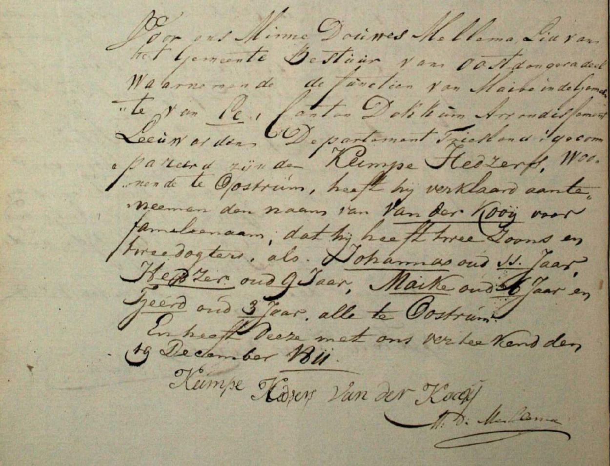 Gezinskaart:Keimpe Hedzers van der Kooi, * 1775, † 1828, zv Hedzer Keimpes van der Kooi & Maaike Piebes (Pybes).tr. 1e Hiltje Tjeerds Straatsma, dv Tjeerd Oenses Straatsma & Johantje Alberts Alberda.Kind van Keimpe en Hiltje: 1. Johanna van der Kooi, * 1800, † 1874.2. Johannes van der Kooi, * 1800, † 1800. 3. Keimpe Hedzer van der Kooi, * 1802, † 1877. 4. Maaike van der Kooi, * 1805, † 1887.5. Tjeerd van der Kooi, * 1808, † 1847. 6. Tietje van der Kooi, * 1812, † 1891. 7. Teetske van der Kooi, * 1816, † 1875. Naamsaanneming:Keimpe Hedzer: 19 december 1811: Keimpe Hedzer(s) van der Kooij (Kooi). Hiltje Oenzes: 12 maart 1812: Hiltje (Tjeerds) Straatsma.