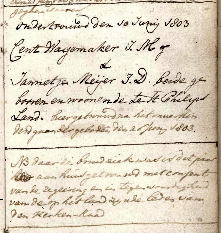 Gezinskaart:Cent Wagemaker, * 1774, † 1838, zv. Willem Wagemaker & Sara den Braber.tr. 1e 1803: Jannetje Meijer, * 1780, † 1864, dv. Willem Willems Meijer & Johanna van der Vliet.Kinderen van Cent & Jannetje:1. Janna Wagemaker, * 1806, † 1877.2. Sara Wagemaker, * 1808, † 1879.3. Willemijntje Wagemaker, * 1810, † 1840.4. Geertje Wagemaker, * 1813, † 1885. 5. Willem Wagemaker, * 1813, † 1834.6. Sent Wagemaker, * 1816, † 1891.7. Johanna Wagemaker, * 1819, † 1892. 8. Adriana Wagemaker, * 1823, † 1870.9. Maria Wagemaker, * 1828, † 1906.