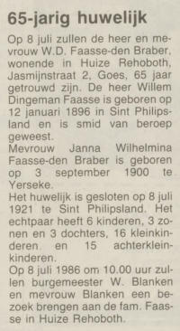 Gezinskaart:Willem Dingeman Faasse, * 1896, † 1987, zv. Andries Faasse & Neeltje Meijer.tr. 1e 1921: Janna Wilhelmina den Braber, * 1900, † 1988, dv. Gerrit den Braber & Maria Cornelia Neele.Kinderen van Willem & Janna:1. Neeltje Faasse, * 1922, † 2020.2. Maria Cornelia Faasse, * 1926. 3. Andrina Gerda Faasse, * 1934, † 2004. 4. Gerrit Faasse, * 1937.5. Willem Dingeman Faasse, * 1940, † 2024.6. Cornelis Marinus Faasse, * 1944.